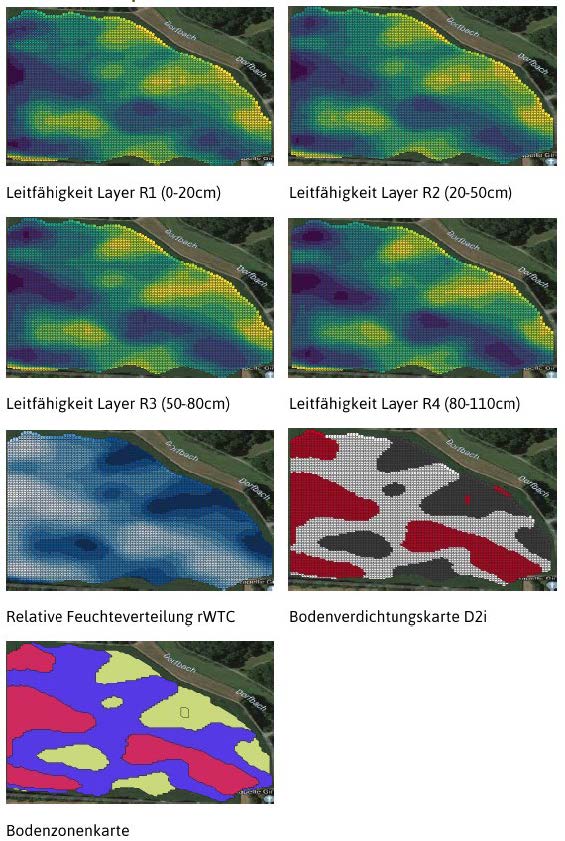 Durch das Scannen des Bodens mittels elektromagnetischer Strahlung können wir den Boden bis in eine Tiefe von 1,1m punktgenau erfassen und dadurch Bodenunterschiede und Bodeneigenschaften messen. Während der Überfahrt wird die relative Leitfähigkeit in 0-20cm, 20-50cm, 50-80cm und 80-110 cm. Aus den daraus gewonnen Daten können dann Information über folgende Bodeneigenschaften abgeleitet werden:
