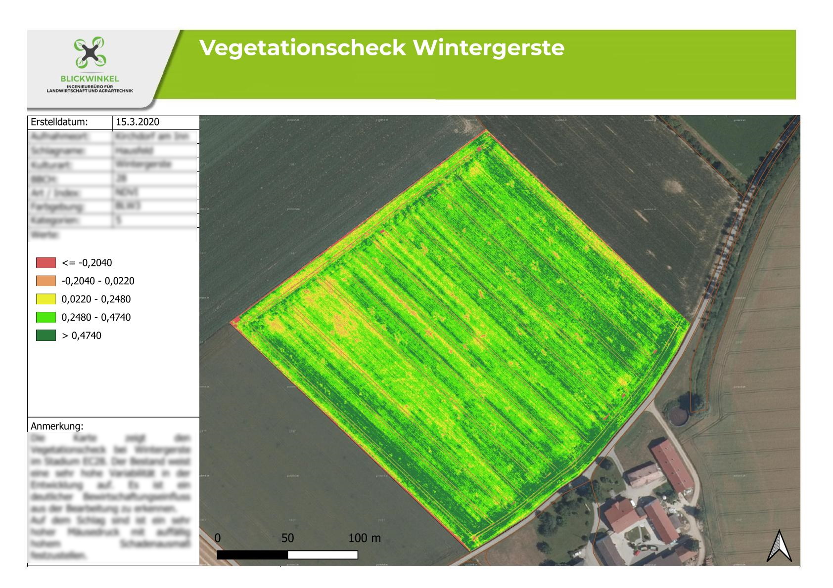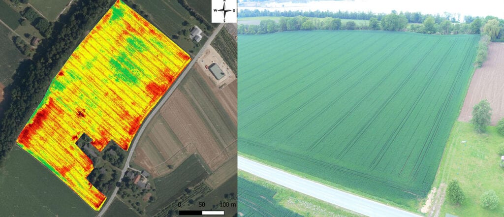 Mit einfachen Vegetationschecks durch Drohnen erhalten Sie, je nach Flugzeitpunkt, eine übersichtliche sowie detaillierte Darstellung ihres Bestandes. Er zeigt in einfachen Worten wie sich ihr Bestand entwickelt und wo Sie reagieren sollen. In den allermeisten Fällen lässt sich anhand der Ergebnisse auch die Ursache für gute bzw. schlechte Entwicklung erkennen.